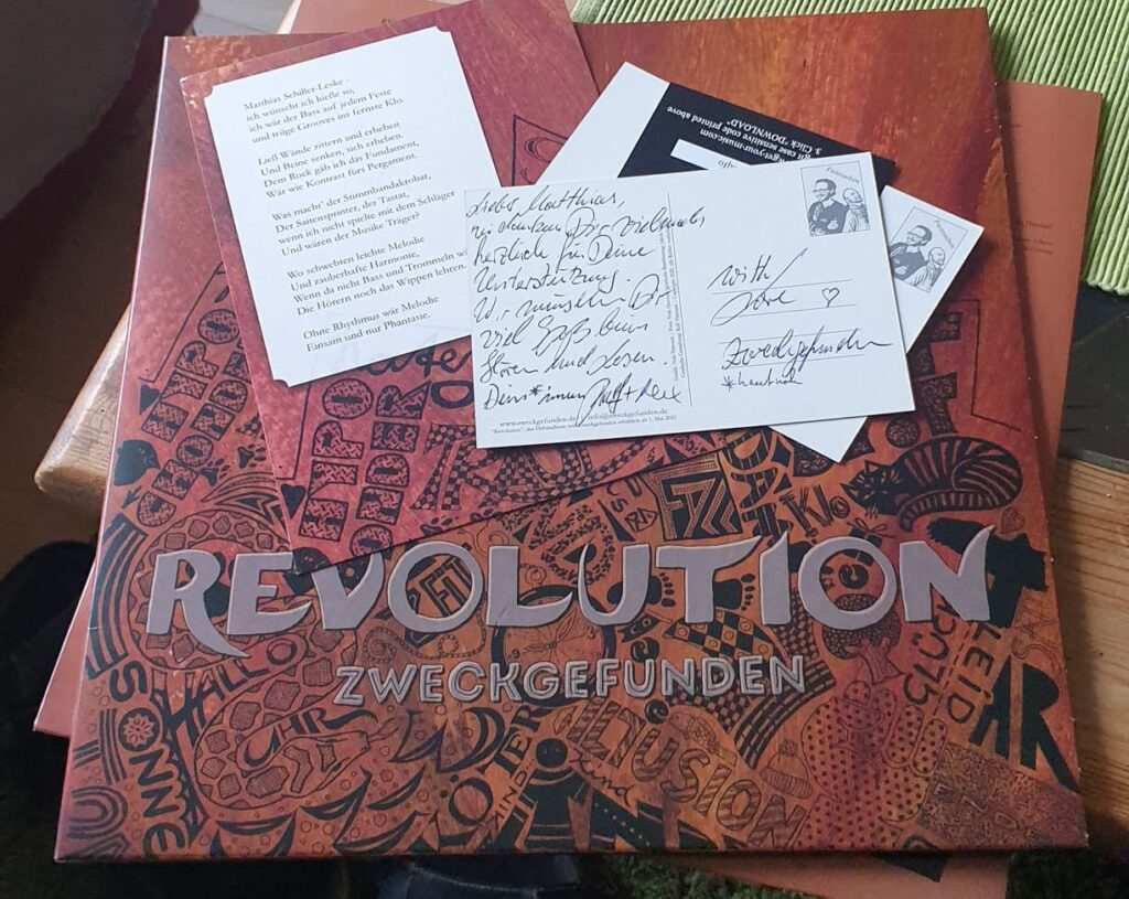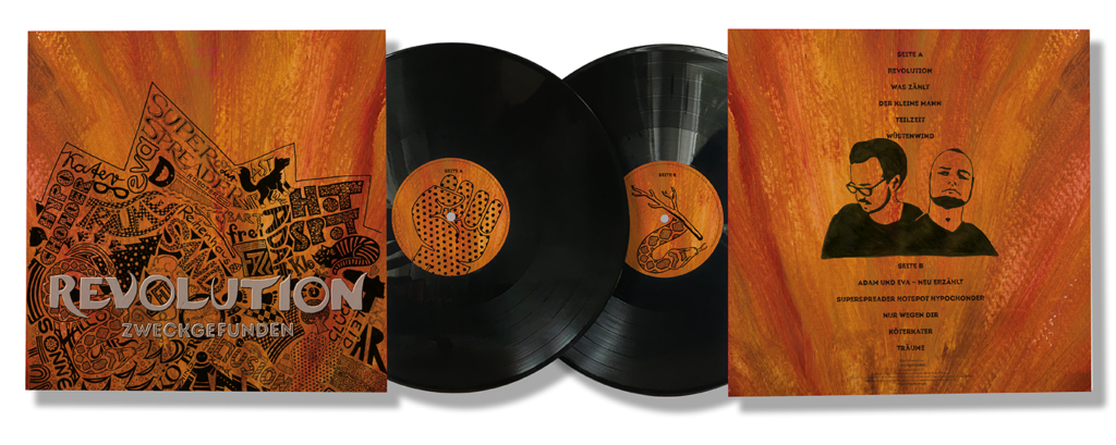 Mit ihrem Debütalbum „Revolution“, das ab 1. Mai 2021 erhältlich sein wird, legen Zweckgefunden eine erste authentische Zwischenbilanz vor. Nicht nur die facettenreiche Auswahl der Lieder und die puristischen Arrangements, die sich auf Gitarren und Stimmen konzentrieren und nur in zwei Stücken durch den dezenten Einsatz eines Cajons ergänzt werden, sondern auch die Wahl des Mediums Vinyl, auf dem ihr Debüt erscheint, machen mit gleich 33 Revolutionen pro Minute ein Stück eines Zweckgefundenabends zuhause fühl- und hörbar.